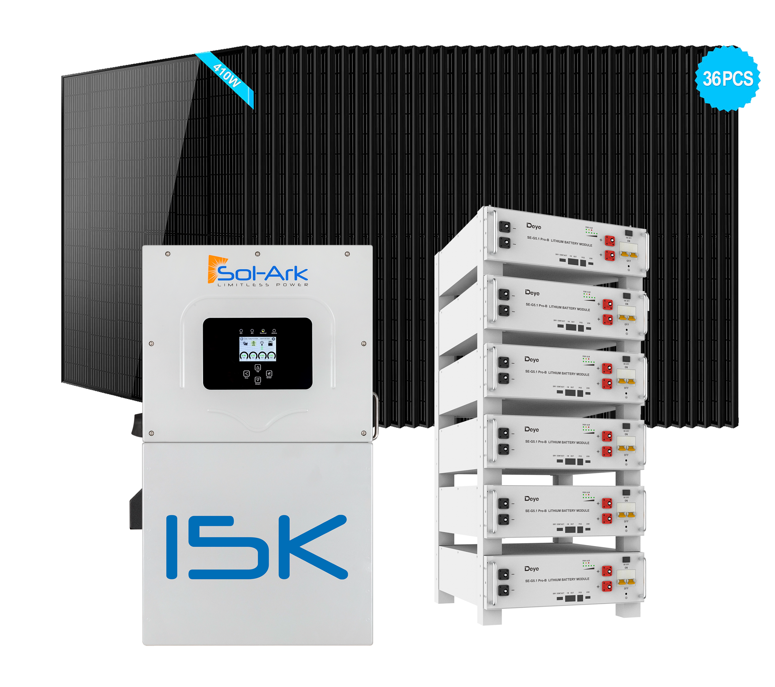 Hybrid Solar Kits With Sol-Ark15K-2P Hybrid Inverter + 6PCS Deye SE-G5.1 Pro-B 5.12kWh LFP Rack-Mounted Battery + 36PCS 410W Solar Panels